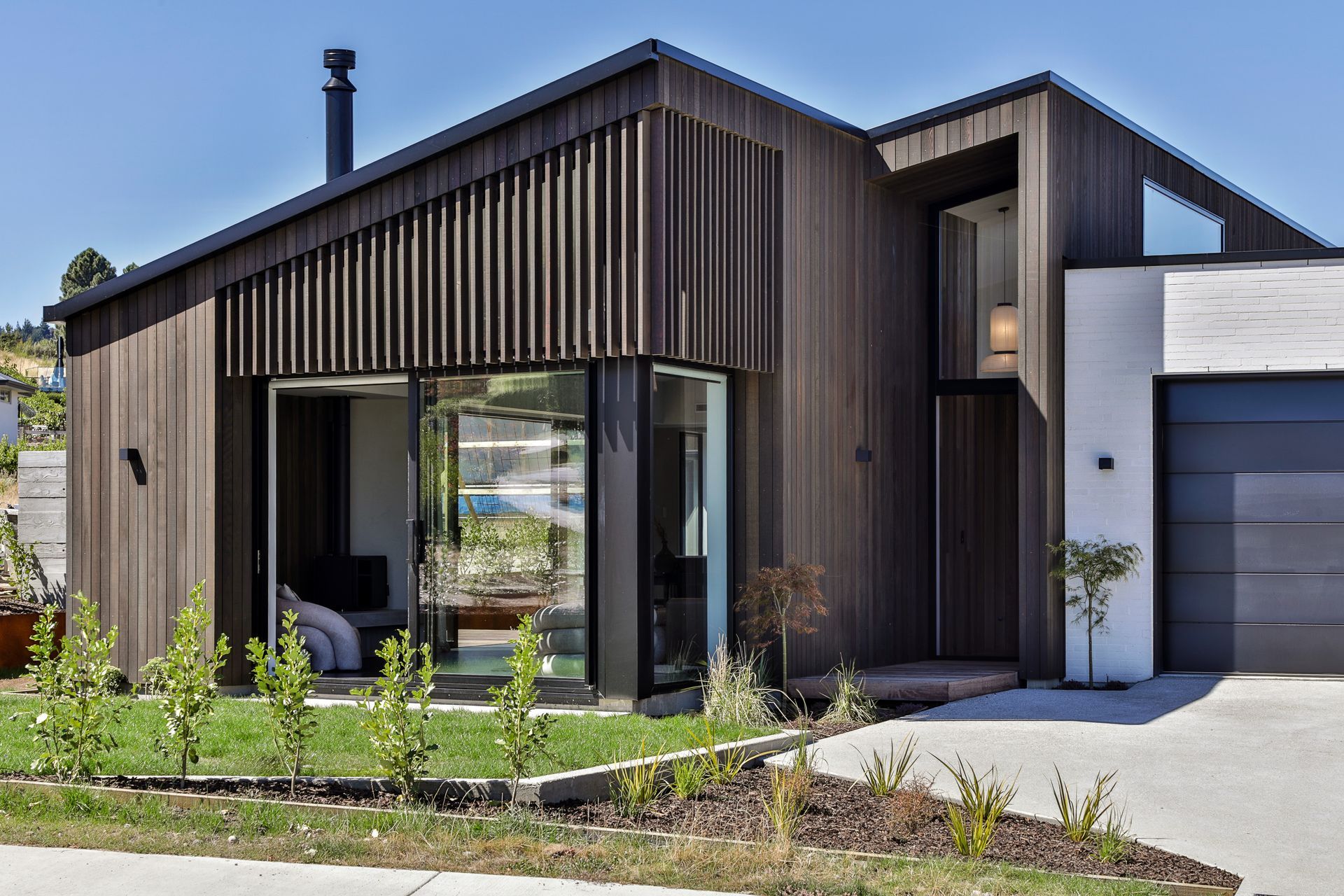 The kitchen functions as both a utilitarian core and a sculptural element, with a fully integrated scullery concealed behind clean, linear joinery. Large-format sliding doors create a fluid threshold between interior and exterior, extending the living area onto a deck that includes a built-in fireplace, designed to support year-round enjoyment of the site.