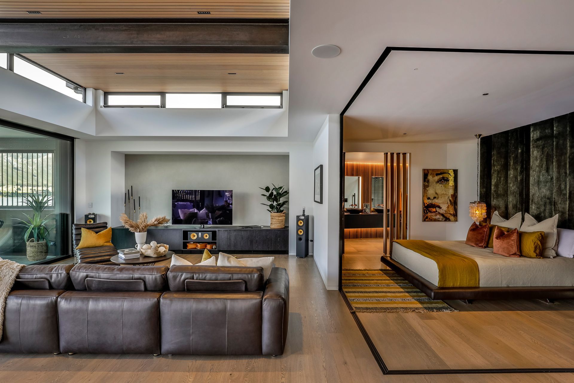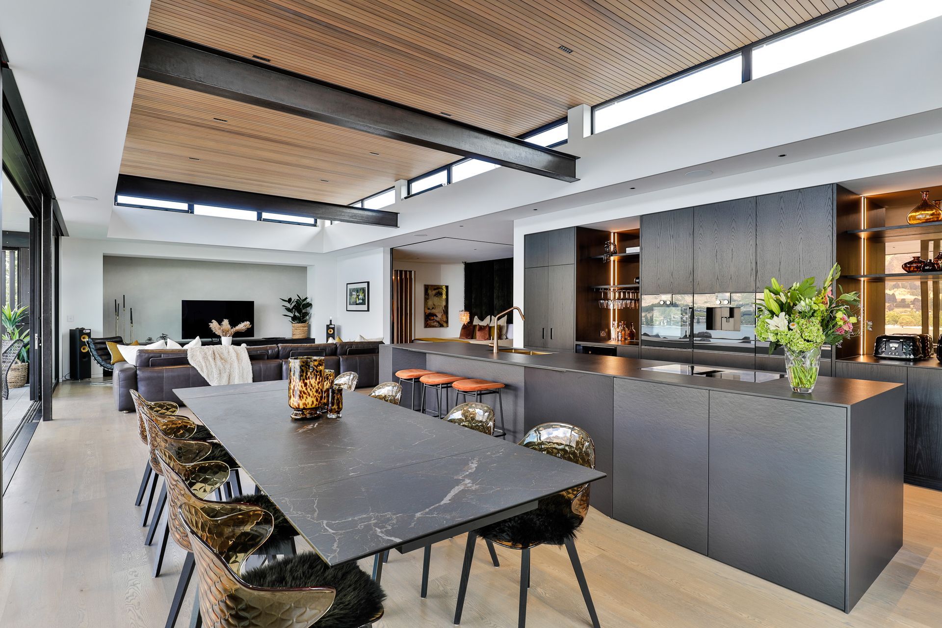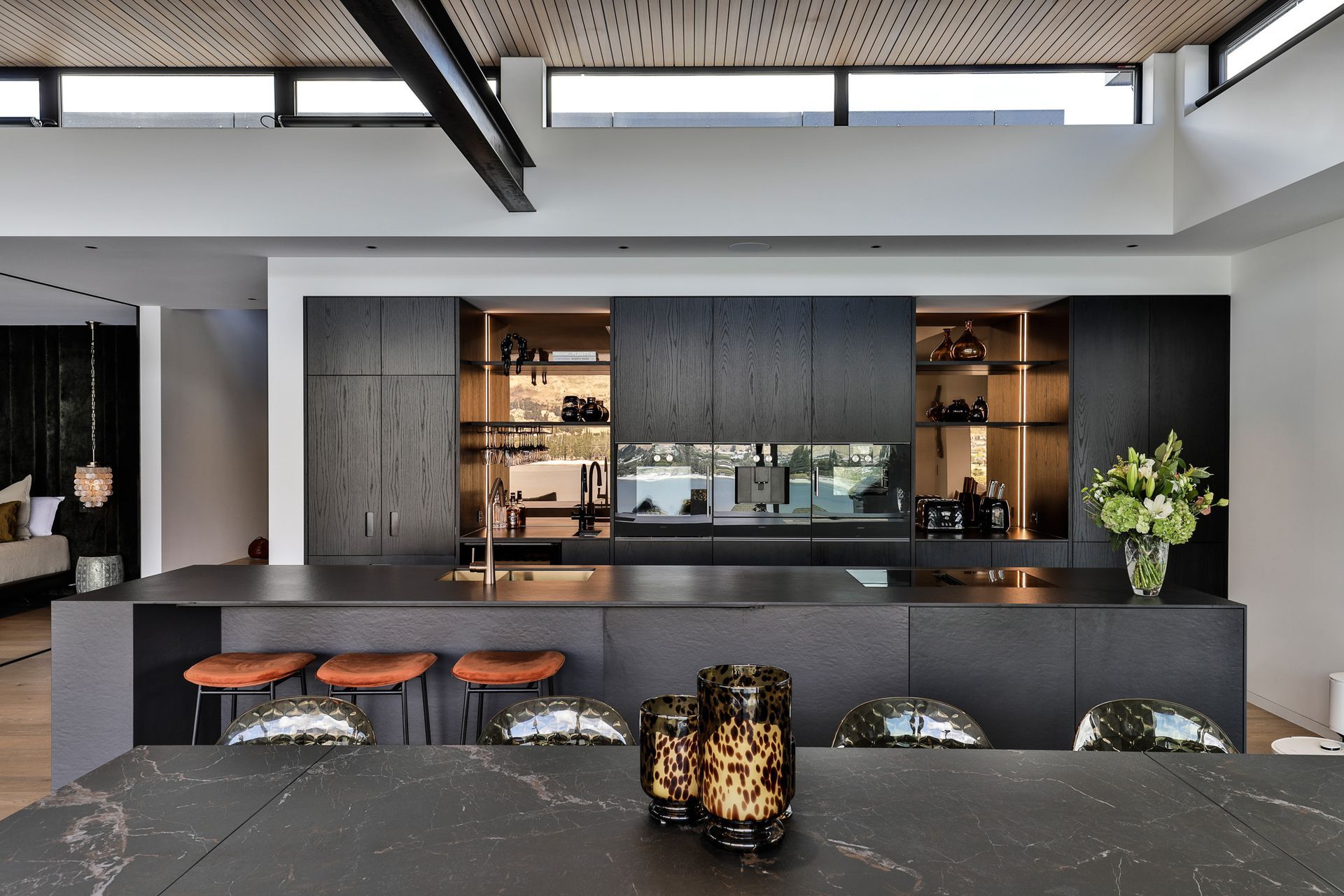 Once inside, the home opens through strategically placed openings to maximise on the views whilst maintaining a sense of privacy, comfort and warmth. Moments of privacy and release continue throughout the interior by use of vertical timber and steel screens, moveable walls and high level windows. Privacy and flexibility were important to the client, who wanted separate spaces for them and their teenage son and also for a separate flat which could be used for guests. Also important, was a sense of home, warmth and comfort within the building which becomes particularly appealing on a cold Central Otago day.