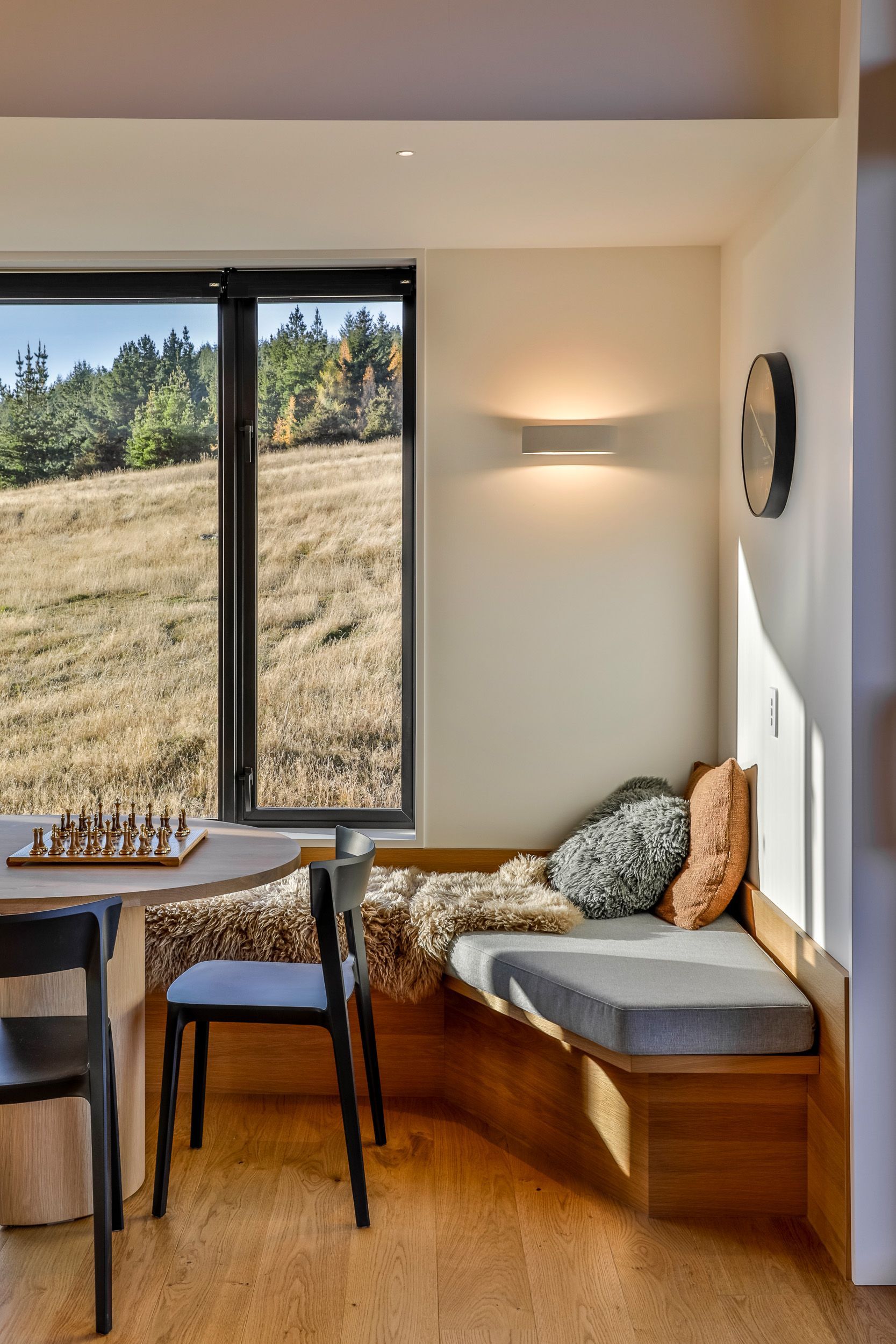 A clear brief from the clients, who envisioned a durable, fuss-free holiday base with room to entertain and unwind, guided the material palette. Natural timbers, tactile stone, and robust finishes were used both inside and out, not only for their longevity, but also to blur the line between indoors and the surrounding landscape. This seamless flow invites the outdoors in, softening transitions and enhancing the sense of space. A masterful play of light and volume allows each room to breathe. Expansive glazing captures the shifting moods of the lake and sky throughout the day, while generous covered outdoor areas extend the living space, offering year-round enjoyment of the alpine climate.