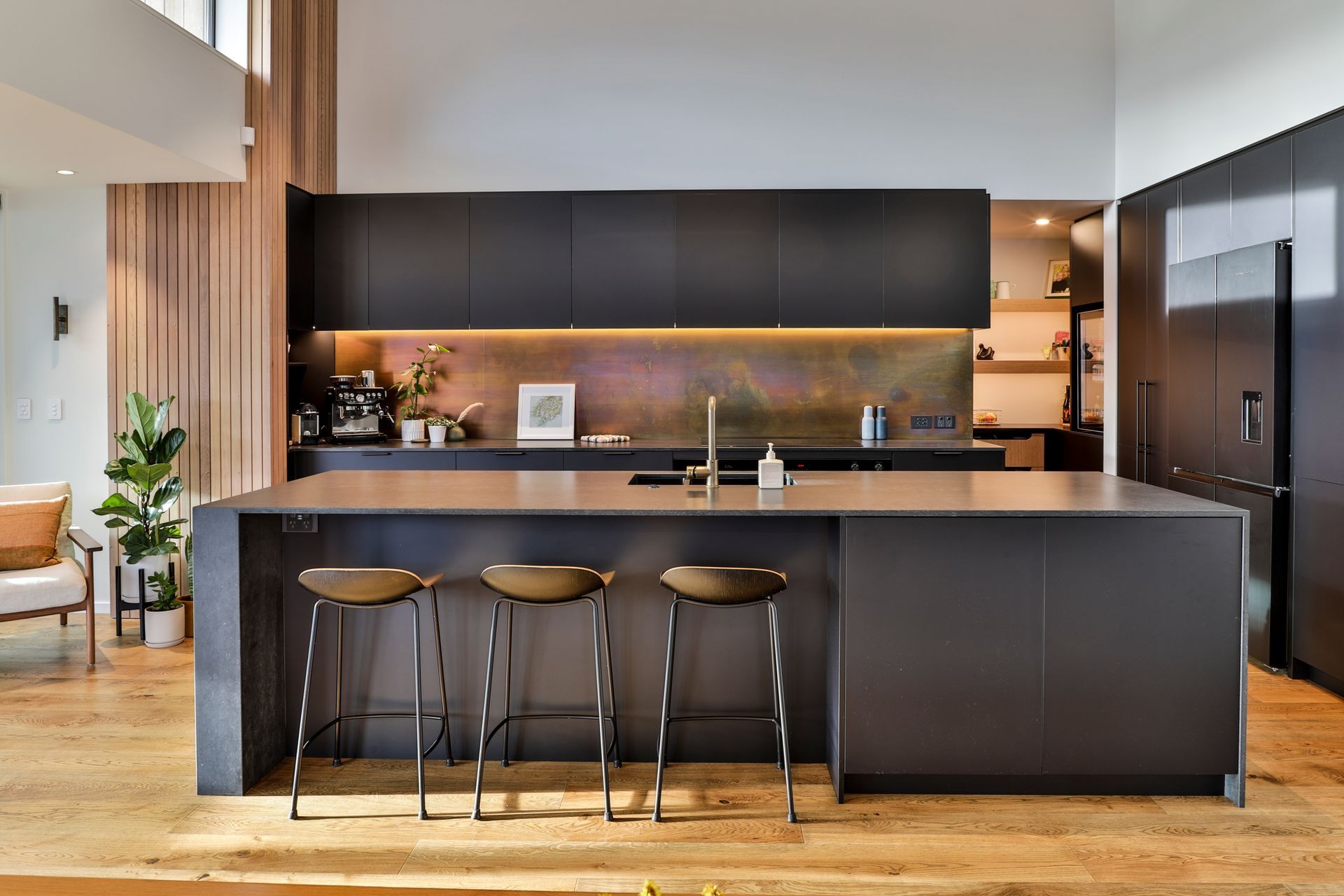 As visitors ascend through the home, the craftsmanship and thoughtful design are evident. The timber ceiling in the main living space creates a homely vibe. At the same time, a dark kitchen benchtop and high windows allow light to cascade into the central dining and living area. Immense sliding doors, skylights and rich interior textures make the space intentional and light-filled.