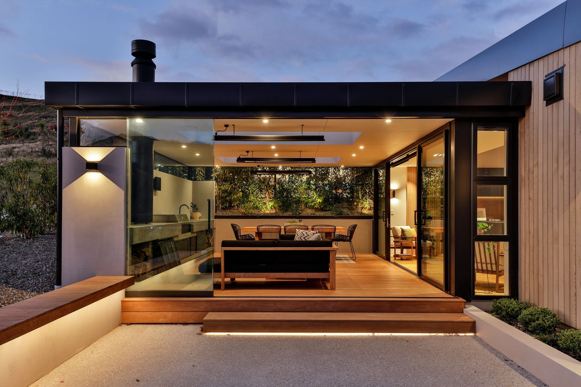 The outside entertaining space is a favourite spot, used year-round by the family. The large sliding glass panels make the space versatile, maintaining heat from the outdoor fire, managing airflow in summer, or cutting out the prevailing wind. The homeowners are delighted with the outcome, noting the emotional and functional purpose behind every aspect of their vibrant home. Every square inch of their 302 sqm home has been maximised to suit their way of living, making it a dream come true.