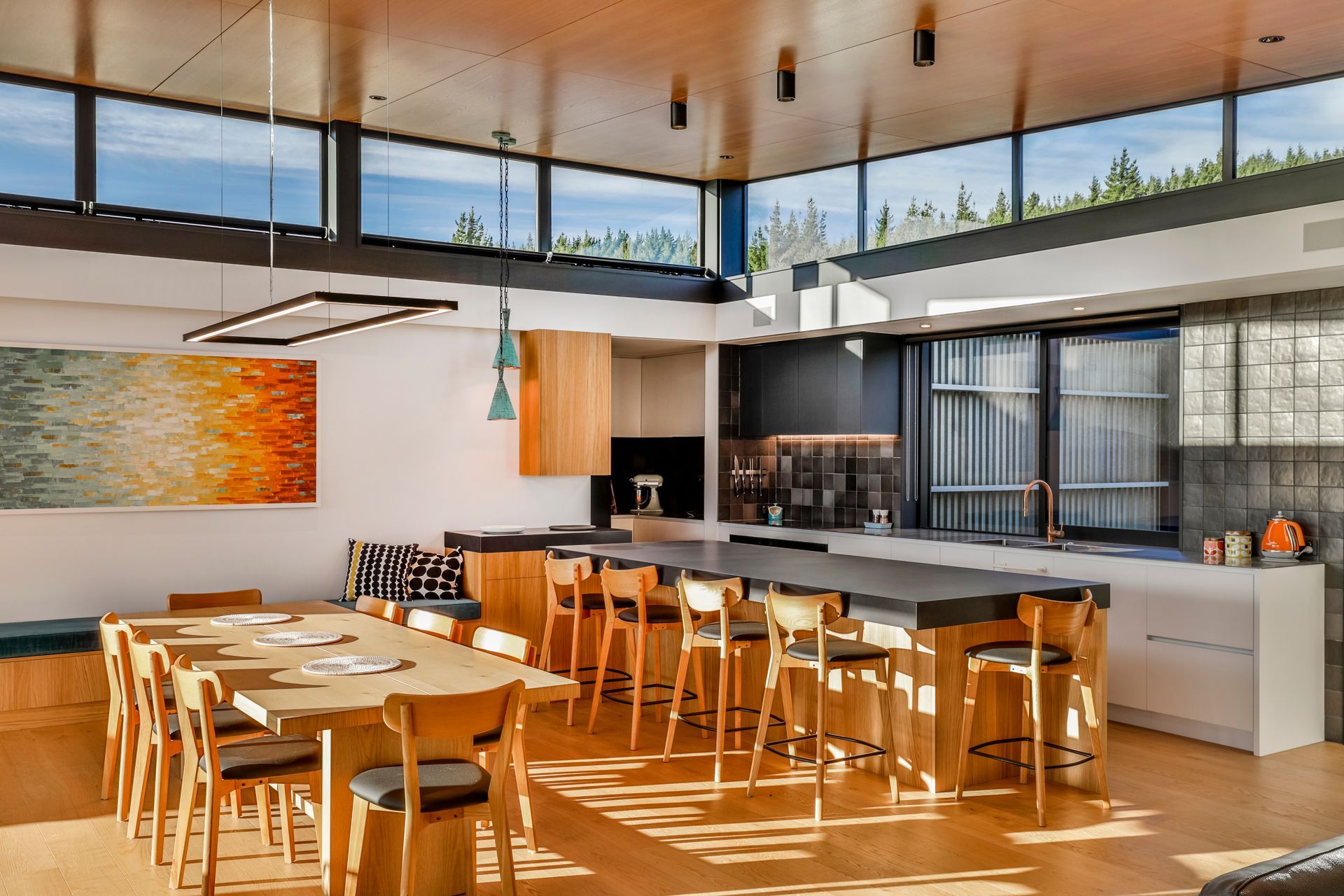 The design philosophy focused on blending modernity with nature, ensuring both the exterior and interior had visual complexity that harmonised with the landscape. The house presents itself as a cohesive collection of materials: concrete block, metal tray cladding, corten steel panels, and cedar weatherboard, all set against the stunning backdrop of the Southern Alps.