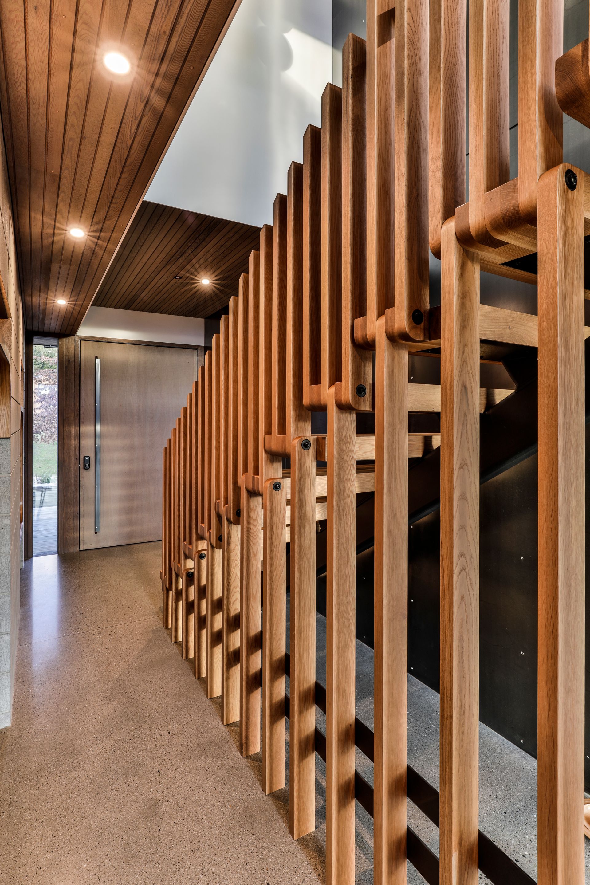 Upon entering, the home reveals thoughtful details that evoke both charm and warmth. Curved entry seating and a sculptural wooden staircase with a unique balustrade echo the essence of winter memories spent on nearby slopes. Inside, raked ceilings on the upper level create an abundance of natural light and warmth, complemented by the rich textures of timber throughout the ceilings, flooring, and joinery.